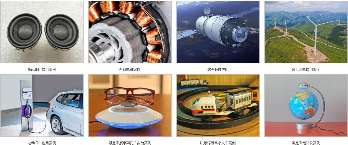 广泛用在电声、电机、手袋、玩具、磁疗、磁悬浮、五金塑胶、电子元器件、电动汽车、风力发电、航天技术等高科技领域。