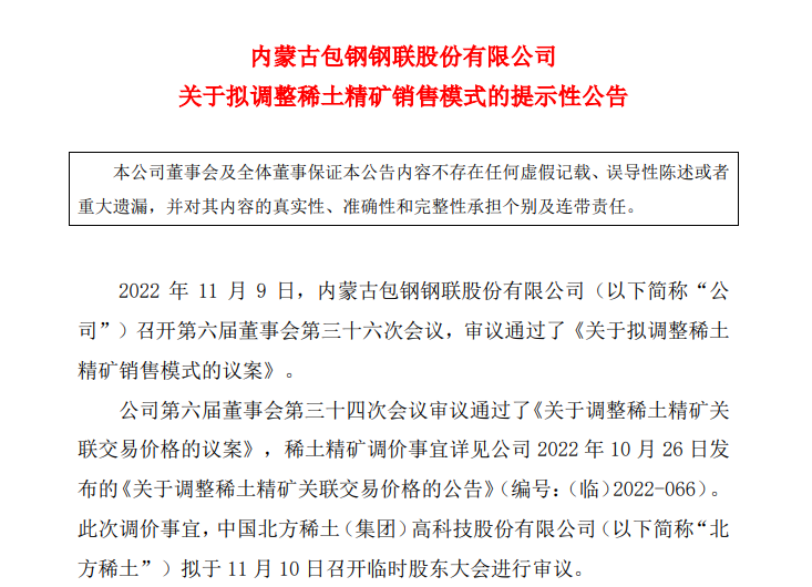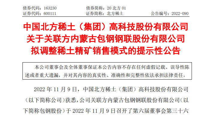 11月9日晚间,北方稀土也同步发布公告,表示公司将持续关注包钢股份调整稀土精矿销售模式的进展。