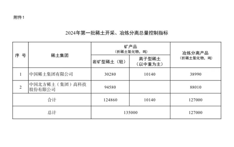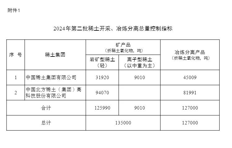 一、2024年第二批稀土开采、冶炼分离总量控制指标分别为135000吨、127000吨(两家稀土集团的分解情况见附件1,不含已下达的第一批指标)。2024年前两批合计稀土开采、冶炼分离总量控制指标分别为270000吨、254000吨。